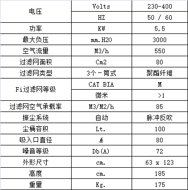 3個聚酯纖維筒式過濾網(wǎng)裝在鋼制過濾艙中,總過濾面積80000 cm2,過濾精度 高達(dá)1微米 。全自動空氣脈沖反吹清潔系統(tǒng)通過壓縮空氣輪流吹向筒式濾網(wǎng),清潔頻率可通過控制面板上的定時器進行設(shè)置,能持續(xù)有效地清潔過濾網(wǎng),清除附著在濾網(wǎng)上的大部分灰塵,從而保持機器正常的吸塵功效和延長濾網(wǎng)使用壽命。模壓鋁制吸塵口直徑為Ø80 mm,位于過濾網(wǎng)下面,能夠同時吸塵、吸固體和吸水(水量不得超過塵桶容量),無需更換或取出過濾網(wǎng)。 壓縮機需另配。